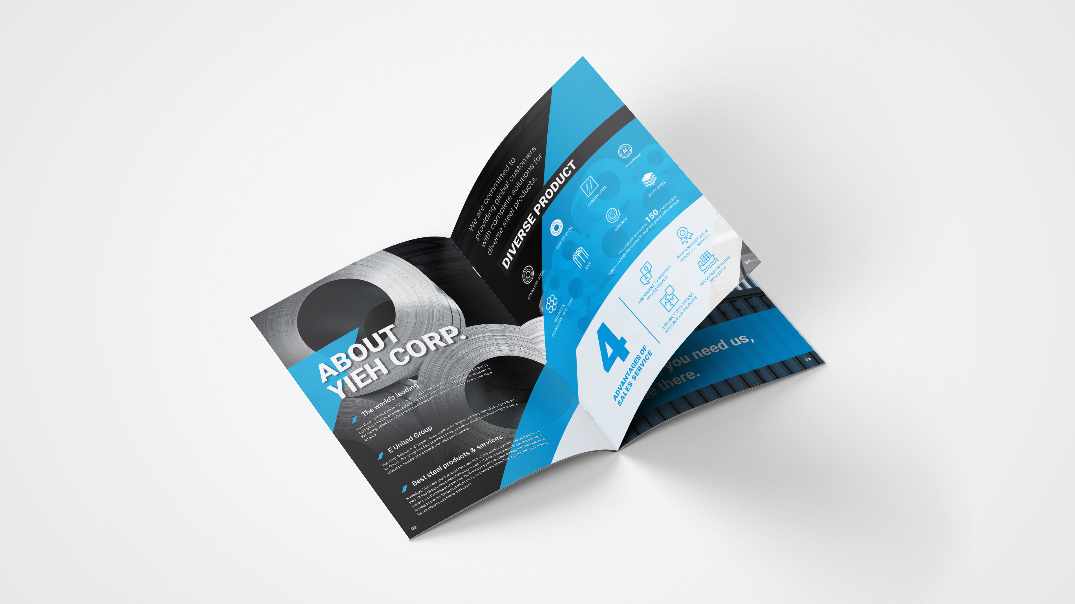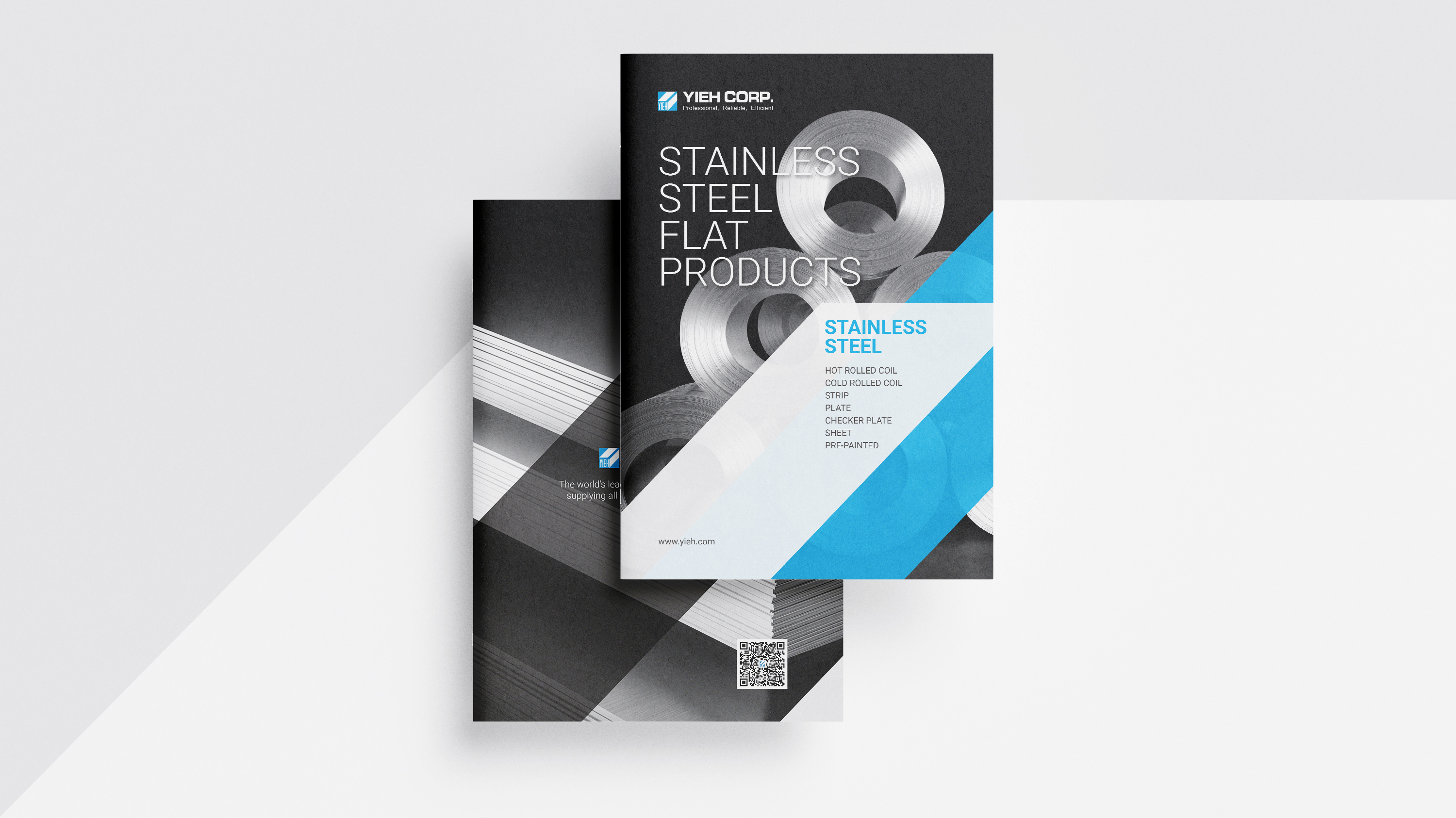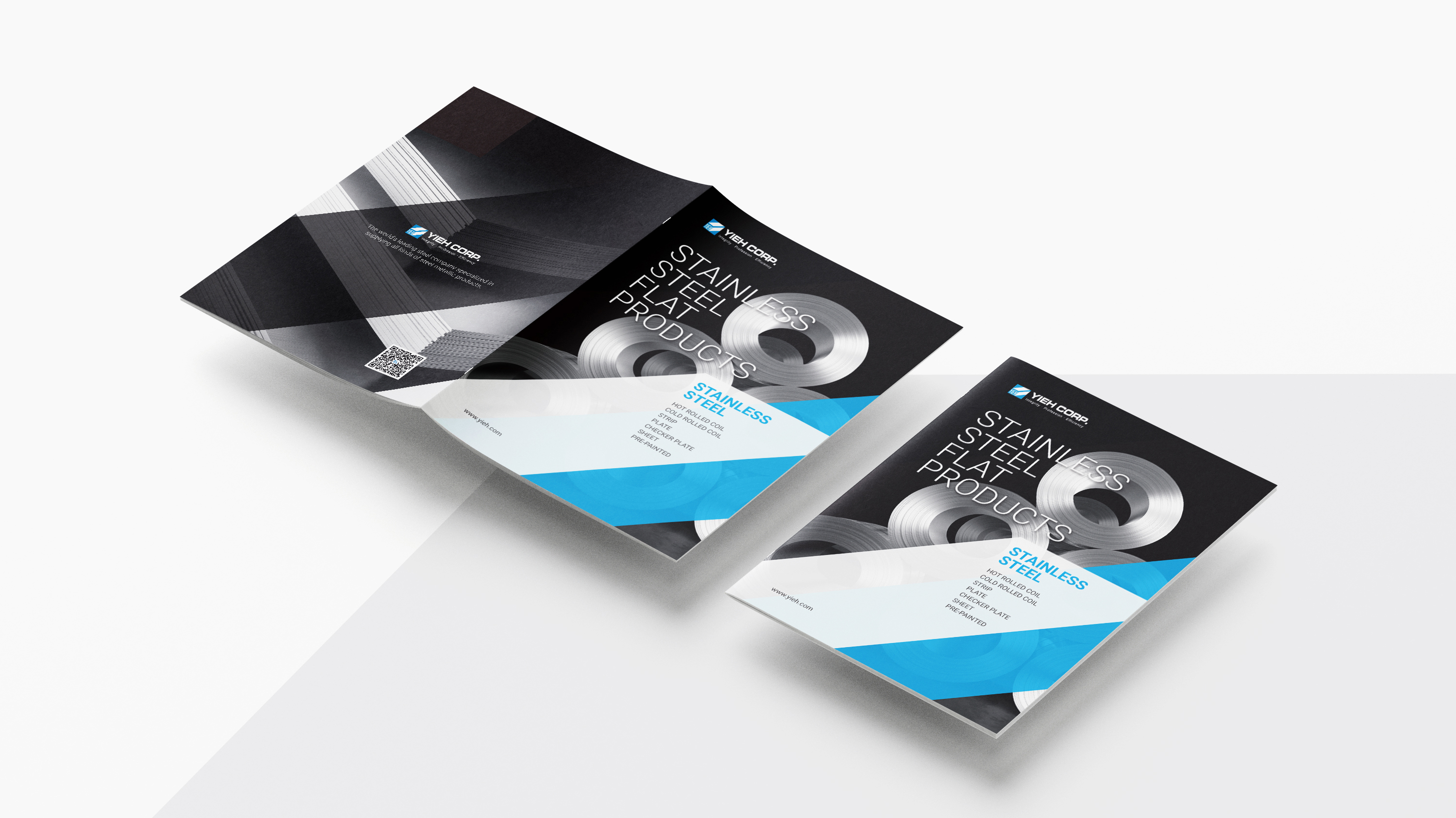 燁貿國際的綜合型錄,封面設計充滿現代感,突顯出不鏽鋼產品的工業質感。以不鏽鋼產品的照片為主體,搭配動感的幾何圖形和色塊,讓整體設計顯得乾淨利落且富有科技感。 內頁也保持了封面設計的色調和元素,從而創造出統一感和流暢的視覺體驗,整體風格簡潔而專業,呈現了燁貿國際對品質和創新精神的承諾。